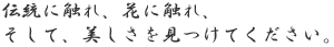 いけばなは生活の中で生まれ発展していった文化です。 普段の生活の中でも小さな花を1本飾るだけで花は部屋全体を 明るくしてくれます。 いけばなを通して花に触れ新しい美を発見していく… その中で今まで気づかなかった新しい自分を感じとり楽しむ ことができれば、貴方の生き方は自然に、 そして、豊かに彩られていくと信じています。